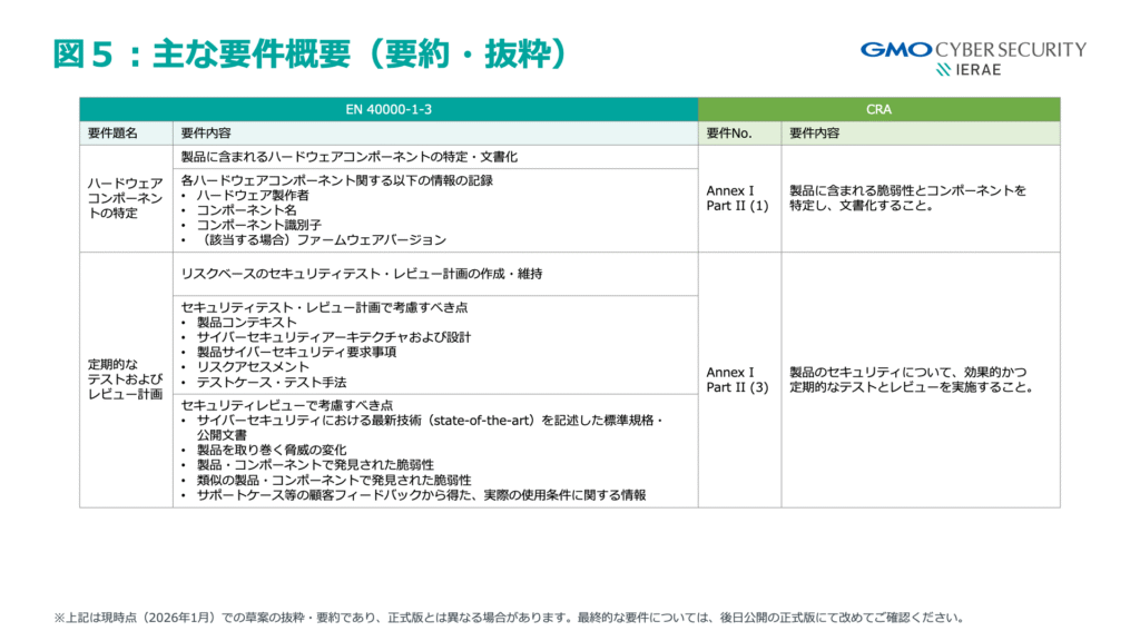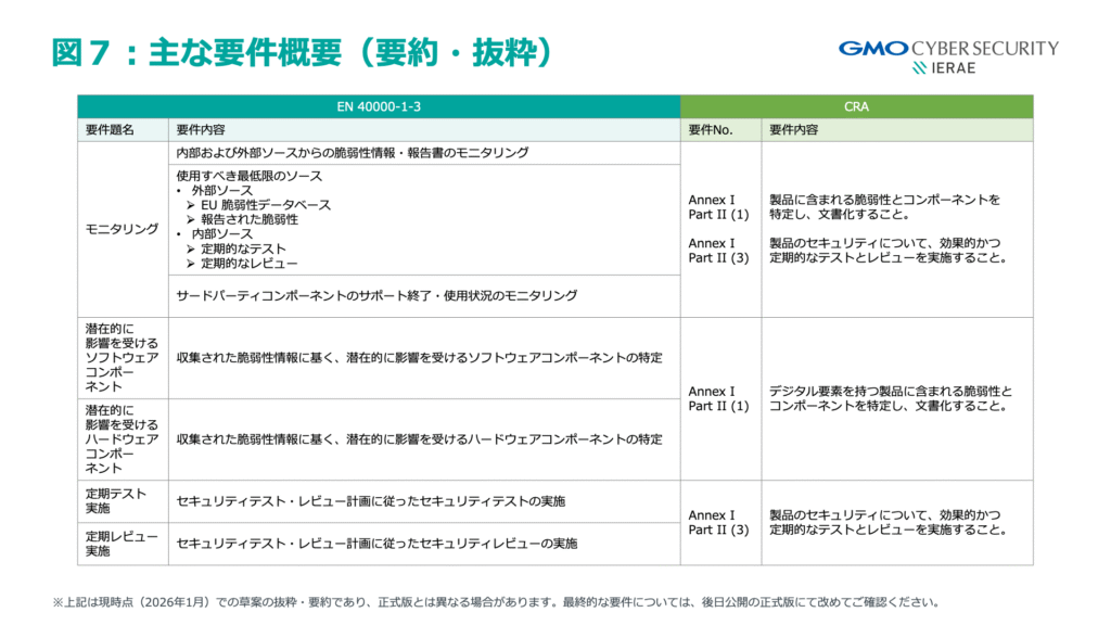 ※ 本稿は、EN 40000-1-3のドラフト版(prEN)に基づき、筆者がその内容を独自に解釈・整理したものです。EN 40000-1-3は現在も策定・検討段階にあり、本稿の内容はCRAおよびEN 40000-1-3の要件への準拠を保証するものではありません。具体的な対応にあたっては、必ず最新の正式版規格原文を確認し、必要に応じて専門家のアドバイスを受けてください。