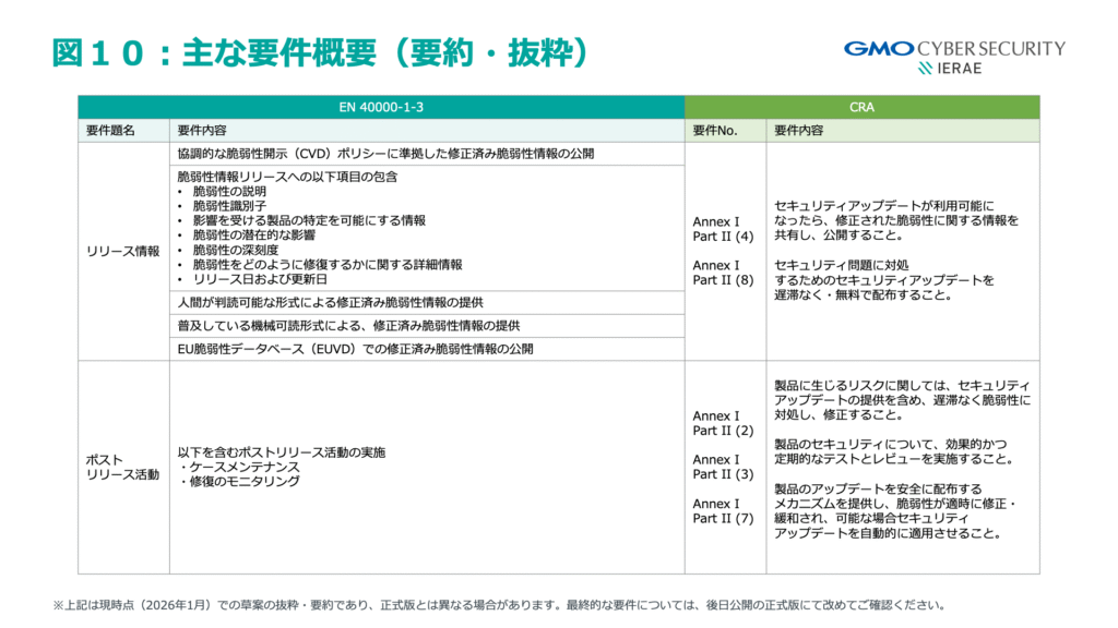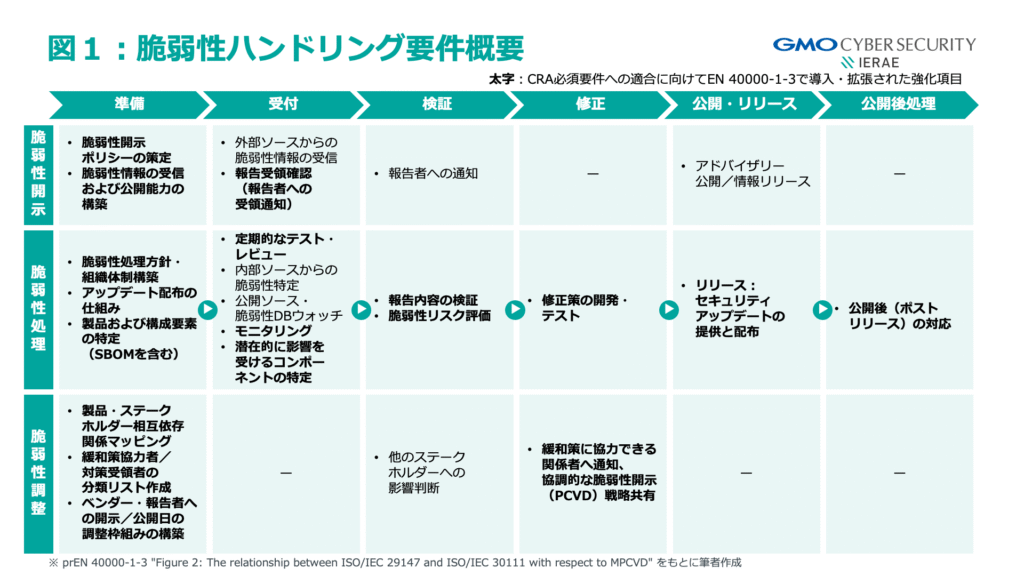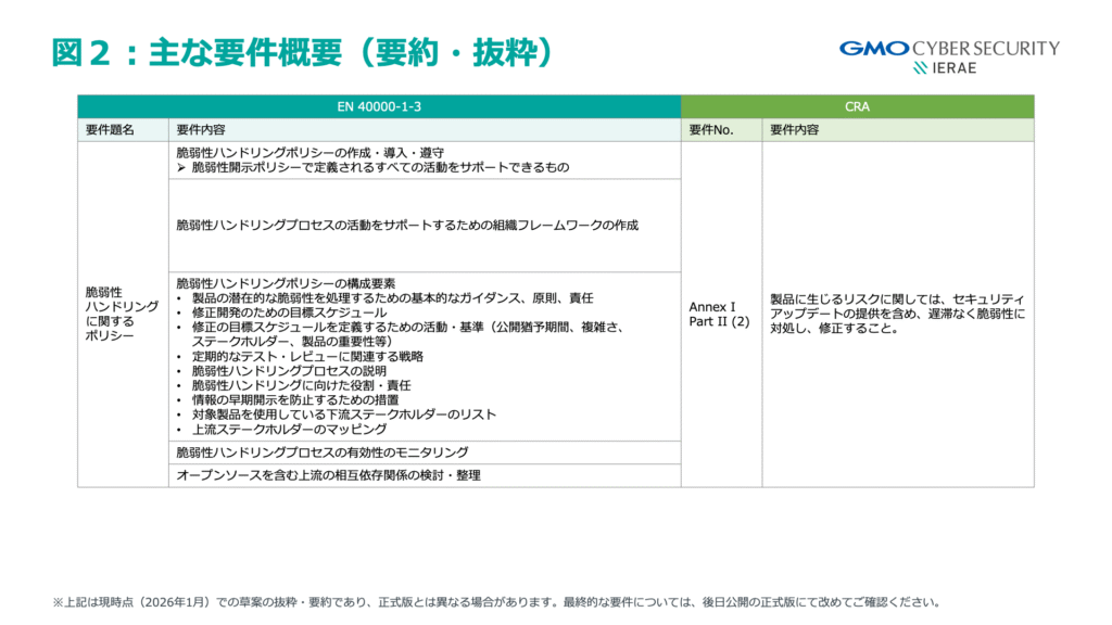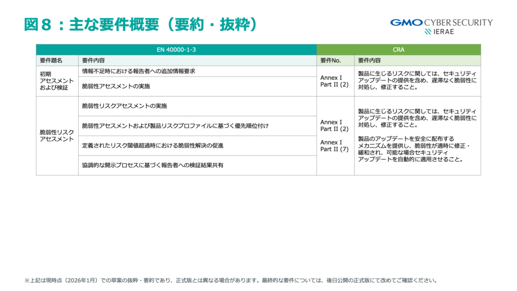そして先日、シリーズの中でも脆弱性ハンドリングの本質的なプロセスを規定するEN 40000-1-3 のドラフトが公開されました。本稿では、このドラフトの要点を整理し、CRA適合のために強化・拡張された主要な要件について紹介します。