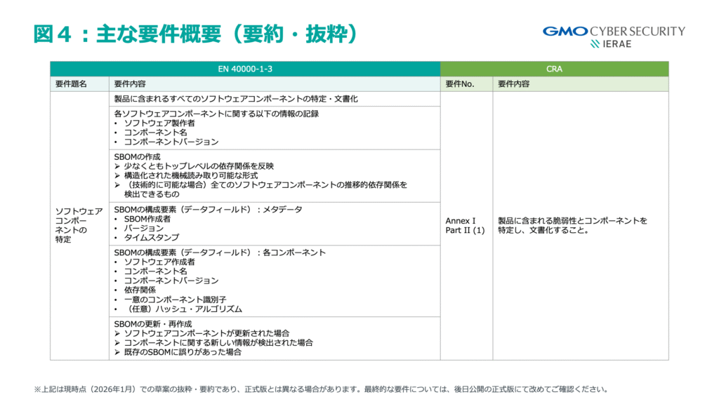 ※ 本稿は現時点(2026年1月)でのドラフト版(prEN)に基づいています。規格の原文では、単なる要求事項に加え、詳細な用語の定義 、要件遵守に不可欠なインプット・アウトプット、適合性を判断するための評価基準、および要件遵守において参考となる他のガイドライン情報等が網羅されています。実装にあたっては、必ず最新の正式版原文を直接確認してください。