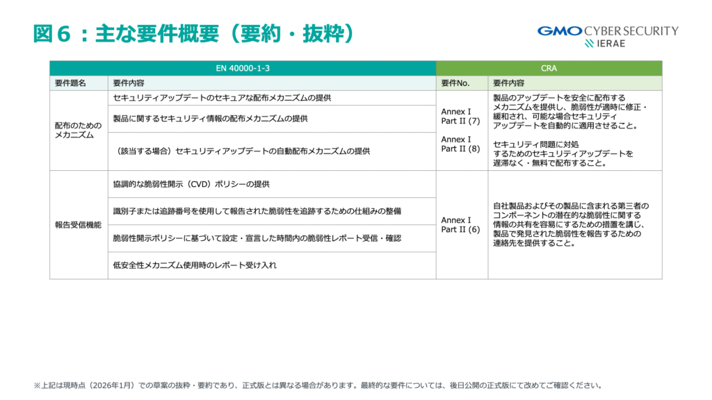 - ・「アップデートを安全に配布する」というCRAの要求に対し、製品自体の配布機能だけでなく、セキュリティ情報の配布チャネルの整備や、配布時の真正性・完全性を技術的に保証するメカニズムの提供が具体的な適合基準とされています。