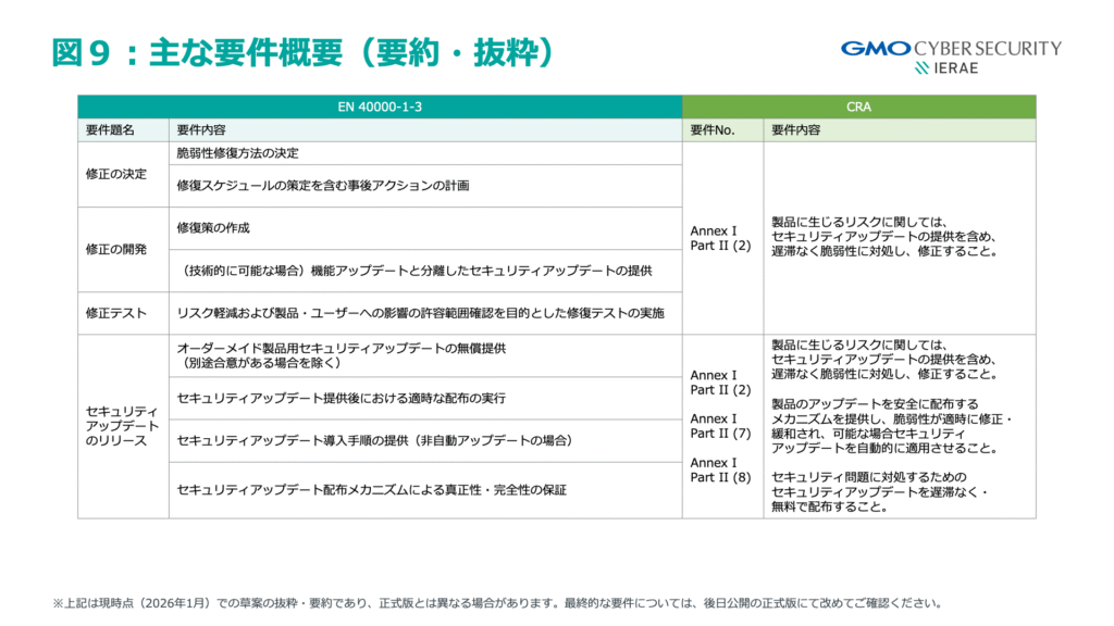 - ・「脆弱性に対処する」というCRAの要求に対し、事後アクションの計画を具体要件として求めています。単に直すと決めるだけでなく、どのような手法(パッチ、設定変更、代替策など)で修復し、どのようなスケジュールで実行するかという具体的なロードマップの策定が義務付けられています。