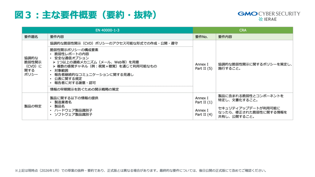 このうち、今回解説するEN 40000-1-3は、2026年9月に発効する「脆弱性報告義務」への対応において最も直接的な指針となり得る存在とも言えます。