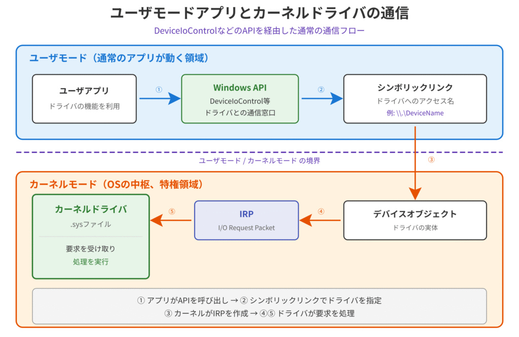 - アプリがDeviceIoControlなどのWindows APIを呼び出す