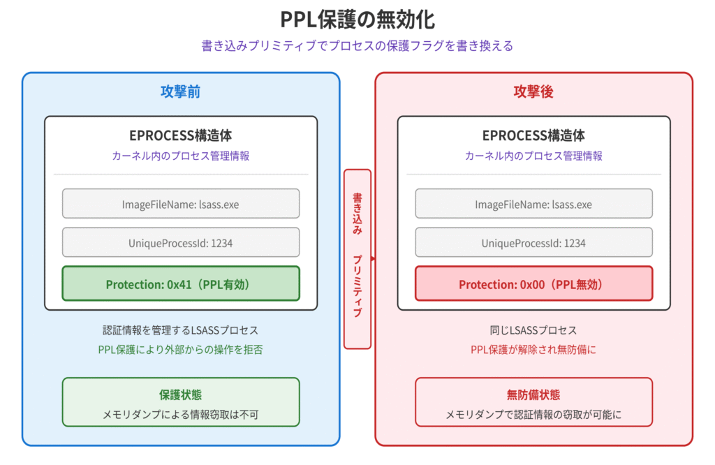 書き込みプリミティブを用いてこのフィールドを書き換えることで、PPLの保護状態を変更することが可能です。