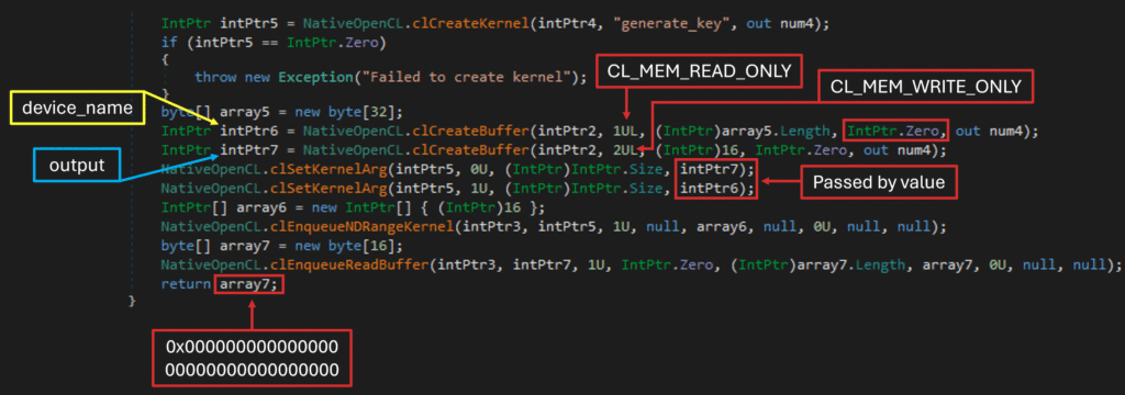 As described by eversinc33’s research on GPU malware, OpenCL can be abused for GPU-based memory operations (e.g., payload decryption or data retrieval via OpenCL kernels). At first glance, GenerateKey() appears to do exactly that. In reality, it is implemented in a way that misleads the analyst and impedes static recovery of the decryption key.