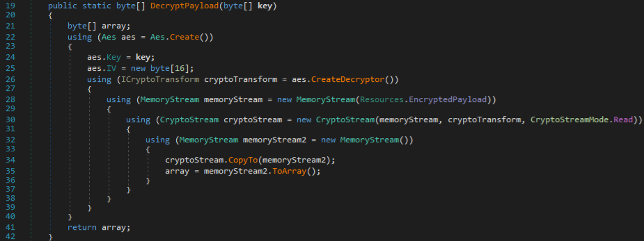 Now that we have the correct key, we can decrypt EncryptedPayload statically. DecryptPayload() uses AES-128 (the key is 16 bytes) and a 16-byte zero array for the IV: