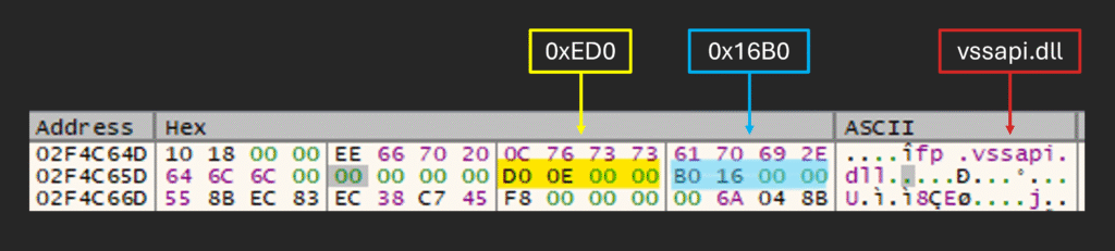 0xED0 is used as the execution offset from the start of the .text section of vssapi.dll, and 0x16B0 is used as an offset from the start of the shellcode to the start of the configuration, which is used in the next stage.