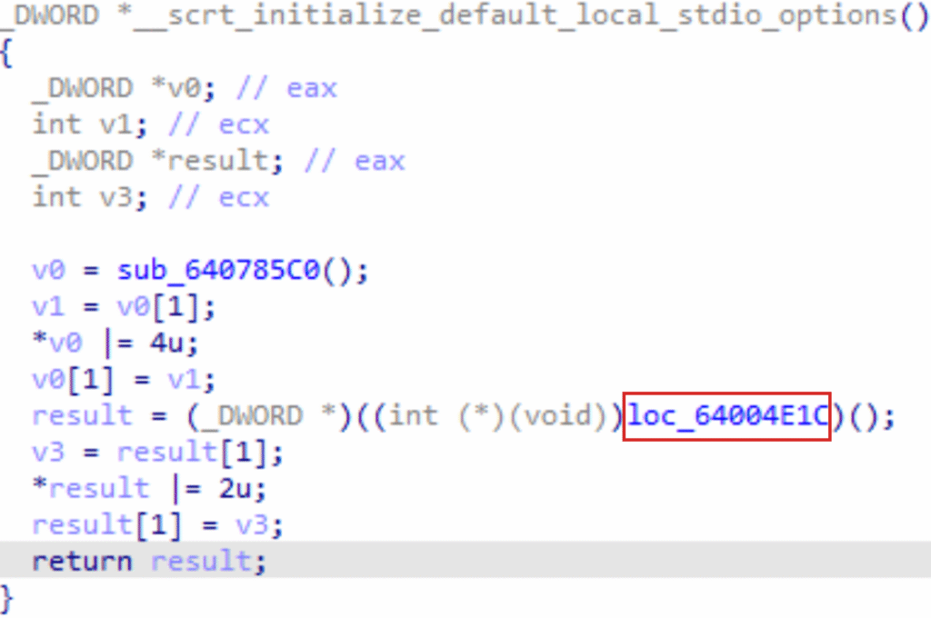 IDA could not decompile the code around sub_64004E1C cleanly, so from this point we continued the analysis in x32DBG to better understand the function.