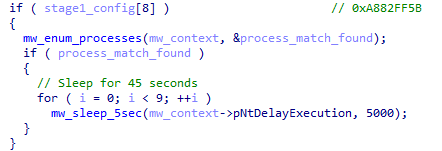 If either comparison matches, it sets process_match_found and delays execution via NtDelayExecution for 45 seconds. avgsvc.exe and avastsvc.exe are processes responsible for the core functionality of AVG Antivirus and Avast Antivirus, respectively.