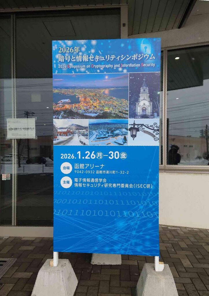 SCISは毎年1月に開催される国内最大級の暗号、情報セキュリティに関する幅広い話題を取り扱うシンポジウムです。査読無しの発表形態であることもあり、新しい試みや研究の途中経過も共有されやすい場となっています。今回のSCISは、北海道の函館アリーナで2026/01/26 〜 01/30の5日間にわたり開催され、全105セッション、発表は407件行われました。